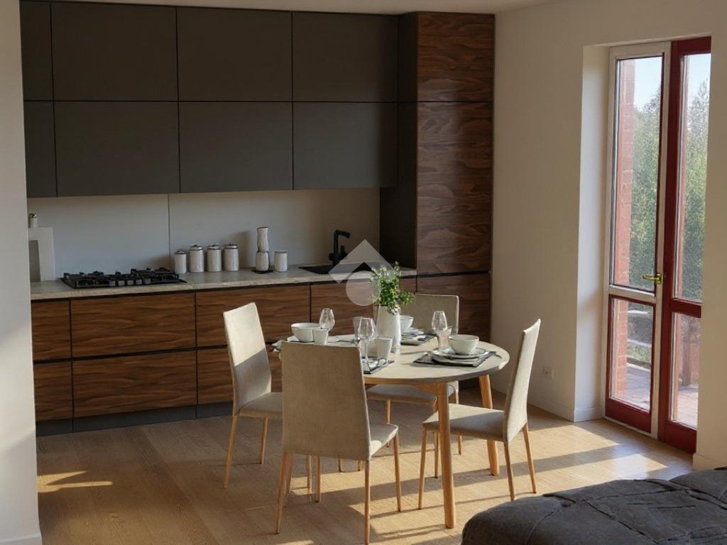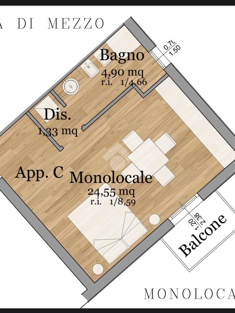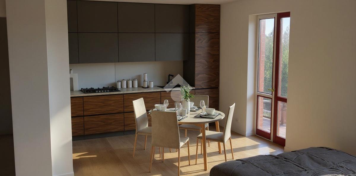 Entrando troveremo una cucina ad angolo, balconata e sulla sinistra antibagno e bagno, con zona lavanderia, box doccia e un balcone.