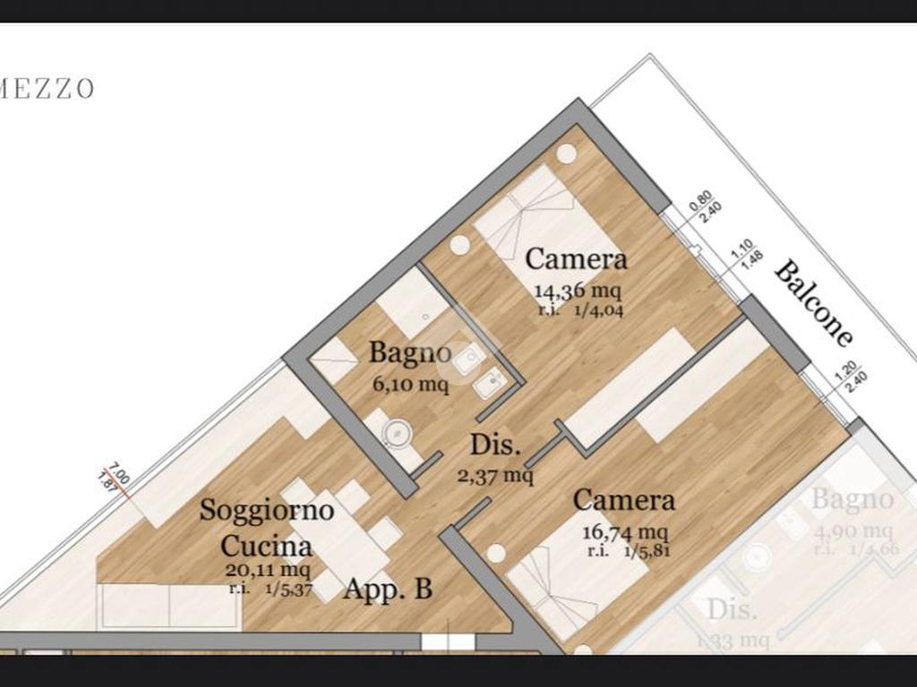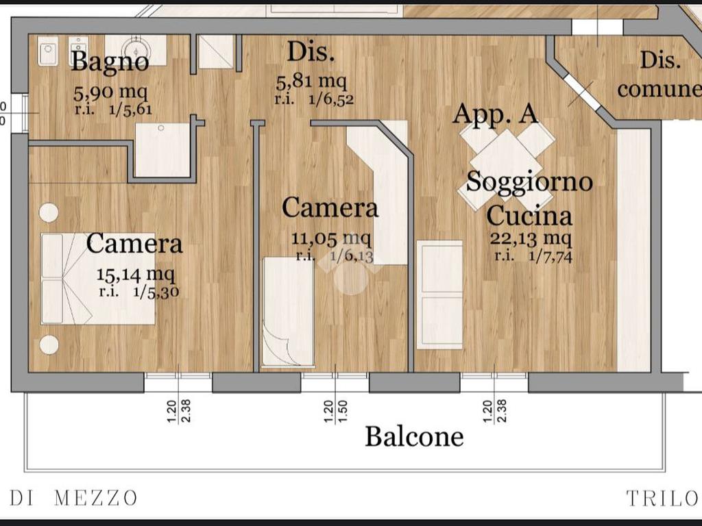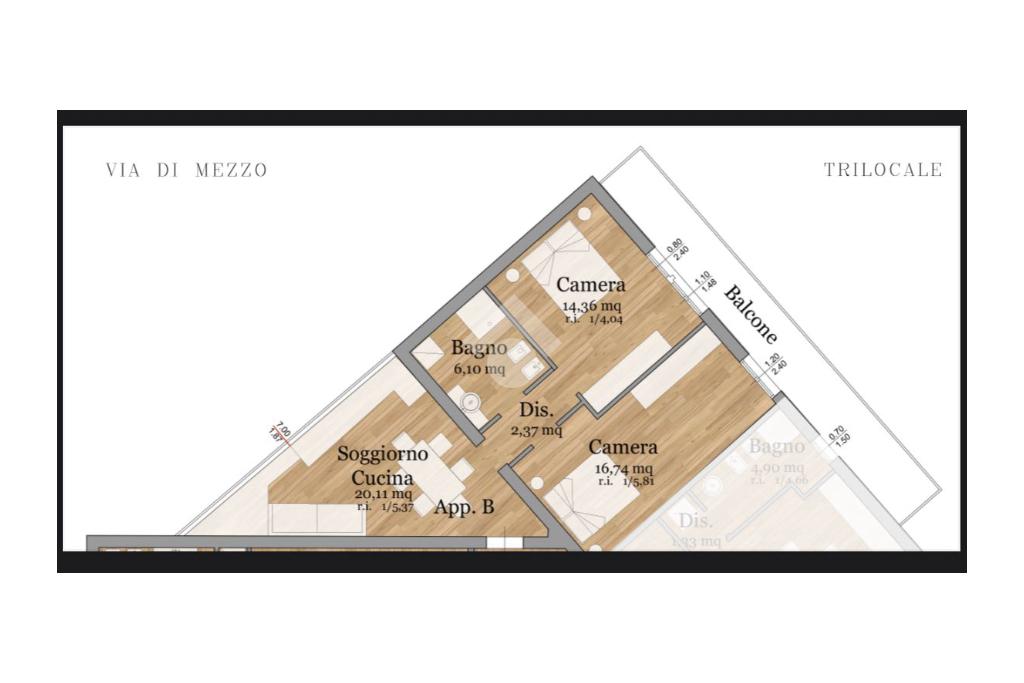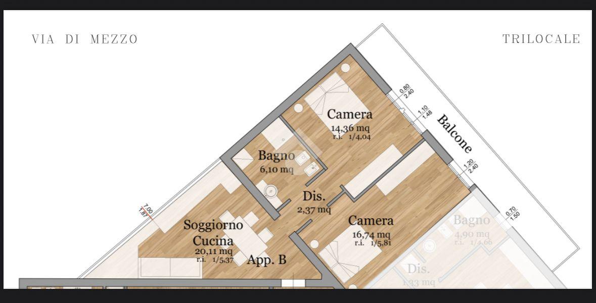 Entrando troviamo una luminosa zona giorno con angolo cottura e soggiorno, proseguendo per il disimpegno si accede alla zona notte, composta da due camere matrimoniali balconate e per finire abbiamo un bagno finestrato con box doccia e zona lavanderia.